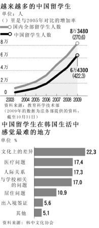 去海外留學(xué)的韓國留學(xué)生在2005年到2009年之間增加了26.5%的情況相反,相同時(shí)期內(nèi)國內(nèi)的外國留學(xué)生增加了約270%。這一期間內(nèi)中國留學(xué)生人數(shù)激增了422%。