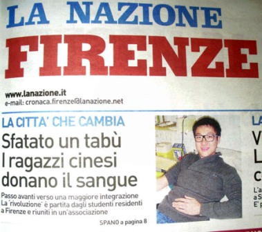 意大利主流媒體民族報(LA NAZIONE)在中國留學(xué)生無償獻血后,在頭版顯要位置率先發(fā)表意大利媒體界資深著名評論員喬瓦尼-斯帕諾的文章,文章以“一項禁忌被打破,中國人開始獻血,”來稱頌中國留學(xué)生為意大利社會所做出的貢獻,稱贊中國留學(xué)生為華人社會帶了一個好頭。喬瓦尼在文章中說,本次中國留學(xué)生的獻血活動,象征著華人向融入意大利主流社會邁進了一大步,并且是特別有意義的一大步。