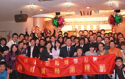 教育室劉占山室長(zhǎng)致祝酒詞。西日本地區(qū)學(xué)友會(huì)會(huì)長(zhǎng)張朔源同學(xué)作為留學(xué)生代表在聯(lián)歡會(huì)上發(fā)言。2010年度西日本地區(qū)學(xué)友會(huì)主要成員也登臺(tái)向大家拜年。