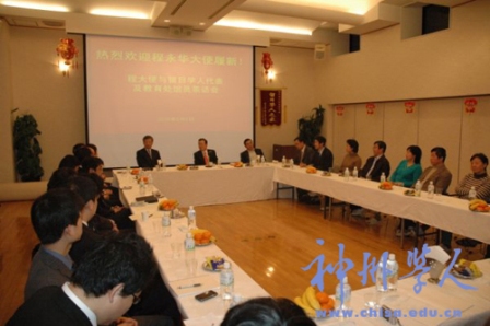 茶話會上,程大使表示時隔4年再次來到教育處與留日學(xué)人代表見面感到十分親切。他說,當(dāng)年曾作為新中國第一批留學(xué)生來日本學(xué)習(xí),對留日學(xué)人有很深感情,F(xiàn)在的留日學(xué)生隊伍擴大到近11萬,這得益于國家改革開放的留學(xué)政策,同時也證明了國家綜合實力不斷增強和教育國際交流的不斷擴大。他說,廣大留日學(xué)人有一顆愛國之心,有優(yōu)良的愛國傳統(tǒng),雖身在海外但始終沒有忘記自己是中國人,在為國、回國服務(wù)中都作出了積極貢獻。希望留日學(xué)人不斷增強愛國心和自豪感,在為國服務(wù)方面更好地設(shè)計發(fā)展方向,在發(fā)展中找到自己發(fā)揮作用的位置。程大使最后表示,大使館今后將更好地為廣大留日學(xué)人服務(wù),并歡迎留日學(xué)人繼續(xù)為祖國發(fā)展建設(shè)積極建言獻策。