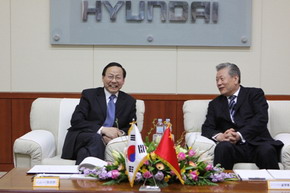 中新網4月13日電 據外交部網站消息,2010年4月9日,應現代起亞自動車集團邀請,張鑫森大使率領由中國駐韓國大使館館員、在韓留學生等200余人組成的“中韓友好產業(yè)考察團”訪問了位于忠清南道牙山市的現代汽車牙山工廠。韓國國務總理室吳鈞局長、知識經濟部、教育科技部、外交通商部等部門官員出席了有關活動。