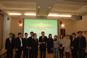 中新網(wǎng)4月21日電 據(jù)《日本新華僑報》報道,青海玉樹地區(qū)發(fā)生7.1級強(qiáng)烈地震后,廣大留日學(xué)人通過各種媒體密切關(guān)注抗震救災(zāi)情況、關(guān)注災(zāi)區(qū)的同胞命運(yùn)。4月18日上午,全日本中國留學(xué)生學(xué)友會會長胡昂以及東京大學(xué)、東京工業(yè)大學(xué)、筑波大學(xué)、早稻田大學(xué)、慶應(yīng)大學(xué)、東京海洋大學(xué)、千葉大學(xué)、日本大學(xué)等8所大學(xué)的中國留學(xué)生學(xué)友會會長來到教育處,將留日學(xué)子為青海省玉樹地震災(zāi)區(qū)募集的第一批賑災(zāi)款60萬日元送到了教育處。中國駐日本大使館公使銜參贊孫建明代表教育處接受了來自留日學(xué)子的第一筆愛心捐款。