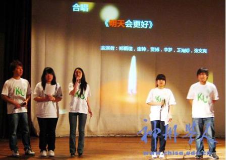 在中國(guó)駐韓大使館教育處的領(lǐng)導(dǎo)和在韓中國(guó)留學(xué)生聯(lián)合會(huì)的號(hào)召下,由建國(guó)大學(xué)學(xué)生會(huì)籌劃舉辦的“情系玉樹”,即建國(guó)大學(xué)留學(xué)生為玉樹災(zāi)區(qū)人民祈福募捐晚會(huì),于4月28號(hào)在建國(guó)大學(xué)學(xué)生會(huì)館小禮堂莊嚴(yán)舉行。