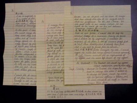 “…此時此刻,我希望專心于洗脫目前我被指控的罪名。長故事短說,他們(校方)將我的電話上的講話斷章取義,指控我“恐怖威脅” (他寫terrorist threat 而非檢方指控的terroristic threat) 。當我問他們(校方)原因時,史蒂文斯(技術學院)回避我的問題只是回答我“你應該小心你的嘴”。之后,史蒂文斯(技術學院)學生發(fā)展部助理副總史德利(Joseph Stahley) 更回應說“我有主導權! (I have the floor)”!爱敃r我不明白(他指什么),他接著解釋說,這是一句美國俚語,意思是現(xiàn)在是我負責!…”