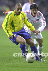 上半場中巴兩隊均排出最強(qiáng)陣容,特別是巴西“五虎上將”羅納爾多、里瓦爾多、羅納爾迪尼奧、卡洛斯和卡福的悉數(shù)登場,更是樂壞全場球迷。中國隊則以李霄鵬、肇俊哲、鄭智、李瑋鋒、李鐵、孫繼海、楊璞、祁宏、魏新、李毅、劉云飛組成首發(fā)陣容迎戰(zhàn)。
