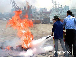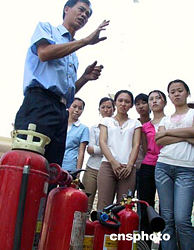 中國第一列跨;疖嚳瓦\(yùn)列車即將開通,應(yīng)聘的列車乘務(wù)員們九月中旬接受海南海事局海船船員專業(yè)知識(shí)培訓(xùn),這是消防教員在講解滅火器的操作。據(jù)了解,這些乘務(wù)員將成為國內(nèi)第一批擁有海船船員資格證書,同時(shí)服務(wù)于陸地與跨海運(yùn)輸?shù)幕疖嚦藙?wù)員。作者:關(guān)向東