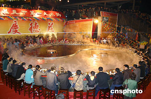 萬(wàn)人品嘗重慶火鍋活動(dòng)是第五屆中國(guó)美食節(jié)暨首屆重慶國(guó)際火鍋文化節(jié)的重頭戲。本屆美食節(jié)組委會(huì)成員、重慶市商業(yè)委員會(huì)主任秦文武說,來自重慶市的近七十家餐飲企業(yè)聯(lián)手奉獻(xiàn)了九百余桌火鍋。上萬(wàn)人同席共燙火鍋的壯觀場(chǎng)面,還是有史以來第一次。