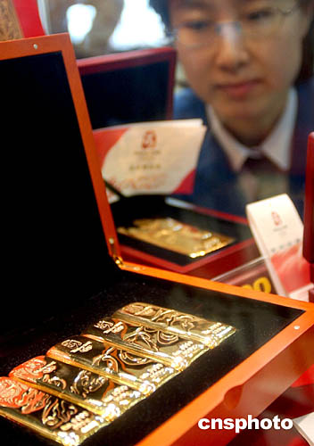 中新網(wǎng)2月4日電 據(jù)《北京娛樂信報》報道, 備受關注的“北京奧運金”今天起將在全國正式發(fā)行。據(jù)悉,這種“奧運金”按重量分為4種規(guī)格,首套“北京奧運金”連續(xù)發(fā)行5條,將5條拼合起來可組成一幅完整的圖案。