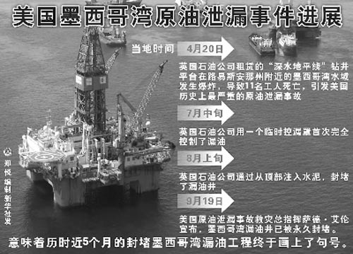 7月12日,作業(yè)人員用一個(gè)臨時(shí)控油罩“大禮帽10號”成功地“罩”住了漏油井管,并向油井中灌入水泥和海底泥漿,從頂部將漏油井封死。漏油井被成功“封頂”后,英國石油公司又對封堵的效果進(jìn)行了3天的壓力測試,結(jié)果未發(fā)現(xiàn)明顯異常。監(jiān)控漏油井的攝像頭傳回的畫面也顯示,已沒有新的原油漏出。此前,原油整整泄漏了87天!