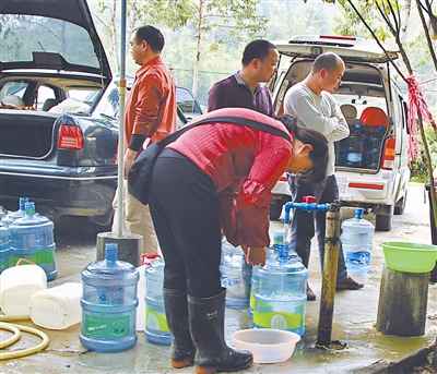 1月31日中午,在廣州市帽峰山腳下的一個賣水點(diǎn),一個上午賣掉了上千桶水。