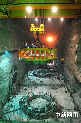 3月23日上午10點(diǎn)40分,在向家壩水電站右岸的地下隧道內(nèi),施工人員用8組鋼纜將重量達(dá)362噸、直徑達(dá)14.38米的座環(huán)固定在1200噸的橋機(jī)上。橋機(jī)緩緩將座環(huán)提升到距離地面2米的高度,慢慢平移近100米,到地下廠房基坑1號(hào)機(jī)組基座上方。座環(huán)平穩(wěn)地放在了1號(hào)機(jī)組基座上,吊裝完成。