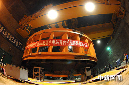 中新網(wǎng)成都3月24日電 (廖時(shí)權(quán) 高峰 石小云)記者24日從中國(guó)長(zhǎng)江三峽集團(tuán)公司向家壩工程部獲悉,直徑14.38米,重量達(dá)362噸的向家壩右岸地下廠房首臺(tái)機(jī)組座環(huán),日前吊裝就位。這是目前世界上第一臺(tái)80萬(wàn)千瓦水輪發(fā)電機(jī)組的座環(huán),它標(biāo)志著向家壩右岸地下電站廠房機(jī)組進(jìn)入全面安裝階段。