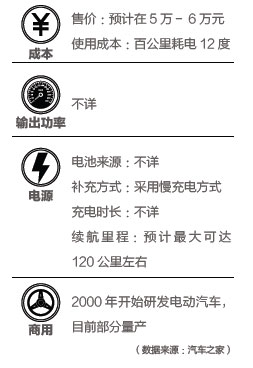 4月初,奇瑞汽車在其總部安徽蕪湖舉行了QQ3純電動(dòng)汽車用戶交車儀式。奇瑞汽車總經(jīng)理助理金弋波告訴《中國經(jīng)濟(jì) 周刊》:“QQ3純電動(dòng)轎車采用純電驅(qū)動(dòng),百公里耗電僅12度左右。目前該車已經(jīng)順利通過國家安全碰撞測試,并已上榜工信部《節(jié)能與新能源汽車示范推廣工程推薦車型目錄》。”