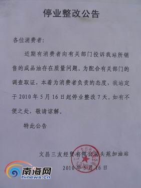 史老板說,5月18日下午他接到相關(guān)部門出具的檢測結(jié)果,對此結(jié)果他沒有異議.在19日中午文昌工商局對他的加油站進(jìn)行整改,目前處于停業(yè)整改期。