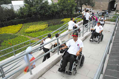 北京殘奧會的舉辦,對無障礙設(shè)施建設(shè)提出了更高的要求。景區(qū)為幫助殘疾人實現(xiàn)自主“登長城、做好漢”的愿望,新建了2部無障礙升降平臺、180米無障礙登城坡道,并對盲道、廁所進行了改造,使殘疾游客從下車到登上長城都可以暢行無阻。目前,八達嶺無障礙設(shè)施已基本涵蓋景區(qū)所有旅游服務(wù)場所。