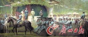 對于潘嘉俊來說,他的黃埔情結似乎更加濃烈些,21年的軍旅生涯讓他對軍事題材的創(chuàng)作格外有激情,“我熟悉黃埔軍校,并畫過有關的連環(huán)畫、單幅油畫和肖像畫”,他說,至今尚未出現一幅表現黃埔軍校歷史的大型美術作品,同時,“人們記憶中關于閱兵的場景作品也極少”,因此,“另辟蹊徑、獨樹一幟”成為潘嘉俊選題的立意。