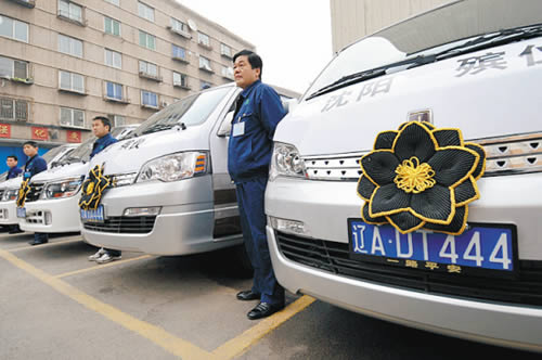 白、灰、棕三色相間的車身上有“沈陽殯儀”標志,號牌后三位均為“444”。10月28日,沈陽市殯儀車集體換裝,在全國率先開始統(tǒng)一殯儀車標識。年底前,全市70多輛正規(guī)殯儀車將全部“變身”換裝。
