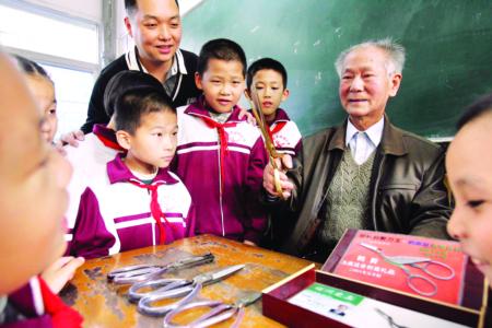 “同學(xué)們會不會說福州話?”福州電視臺《攀講》節(jié)目主持人“土豆”發(fā)問了!拔視!我會!”孩子們的情緒馬上高漲了起來,紛紛舉手,表示自己是個小小福州人!罢l知道我們福州的傳統(tǒng)手工藝有哪些?今天,我們給大家介紹三位傳統(tǒng)手工藝的傳人,首先是剪刀狀元!”在孩子們的掌聲中,“鄭興利”剪刀的第三代傳人鄭德官走上講臺,八十高齡的他首先拿起一把剪刀,為孩子們講起有關(guān)“福剪”的往事。同學(xué)們被新奇的故事吸引了。鄭老又拿出幾把自己生產(chǎn)的特色剪刀,有的剪刀頭鑄成圓弧狀防止傷人,有的剪刀小巧可愛,有一把剪刀做成了一只仙鶴的形狀。