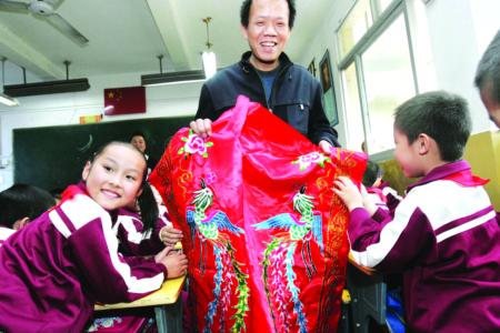 看著穿著統(tǒng)一校服的同學(xué)們,福州刺繡傳人張三忠說(shuō):“如果是在過(guò)去,七八歲孩子的衣服上會(huì)有好多花樣,花紋圖案都是繡上去的。”說(shuō)著,他拿出一幅繡品,一件繡著金線鳳凰的紅色綢緞,同學(xué)們都說(shuō)太好看了,都想用小手摸一摸,張先生爽快地答應(yīng)了。孩子們一個(gè)個(gè)走過(guò)去,用手觸摸有上千年歷史的福州刺繡。張先生說(shuō),此時(shí)他想到,“未來(lái)”正在感知“歷史”。