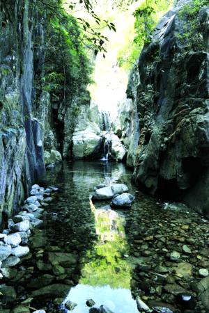 沿著黃巢山盤(pán)旋而上,到半山時(shí)下車,順山腰行20分鐘,就進(jìn)到峽谷。谷底是滿眼美麗的鵝卵石———這是峽谷下游的河床,溪水蜿蜒數(shù)公里,再匯入晉江。冬季水枯,光溜溜的鵝卵石,密布河床。潺潺溪水,沖出圈圈水紋,太陽(yáng)映在潭底,光影動(dòng)人。