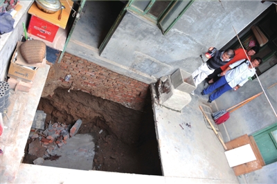 昨天上午,記者在現(xiàn)場看到,這處塌陷坑位于院子的東北側(cè),上面一塊長近3米、寬近2米的石板整體隨之塌了下去。從坑內(nèi)可以看得到房子的地基。