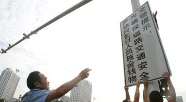 昨日,石市交管局設(shè)施大隊在建設(shè)大街裕華路口安裝了四塊“嚴(yán)禁施舍”警示牌。設(shè)施大隊彭連升表示,乞討人員嚴(yán)重干擾了交通安全,交警曾將一些乞討人員送到救助站,但乞討人員并不愿意留在那里。無奈之下,交警掛出警示牌提醒司機(jī)注意安全。