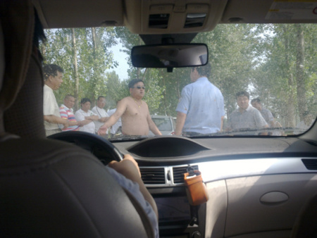 面對民警,在摩托車被推開后,不明身份人員仍不愿放行,“金鏈子”裸著上身更是蹲在車前不肯起來,稱“除非賠我們莊稼錢”……經(jīng)民警多次勸說,記者終于在當(dāng)日下午4時許安全抵達(dá)了狼城崗鎮(zhèn)政府。