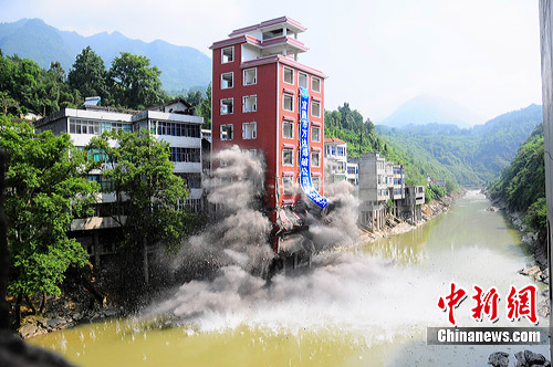 爆破既不能損壞連體的4層樓房,又不能長時間堵塞河道,倒塌距離必須嚴格控制在20米以內(nèi),技術要求高。工程施工方采取定向爆破和原地爆破兩種方式同時進行,安裝了60公斤炸藥對房屋實施爆破拆除,此次爆破非常成功,被網(wǎng)友稱為“最!钡暮又羞`章建筑終于強拆。