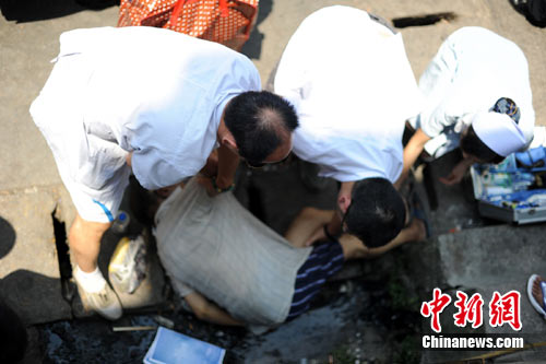 中新網(wǎng)重慶7月30日電(連肖 劉函冉)30日下午14時許,記者路過重慶陳家坪汽車站時看到,一六旬老人倒在車站出站口外的排水溝里。“120”急救人員稱,該老人極有可能是因下空調(diào)車后,無法適應(yīng)室外40多度的高溫,突發(fā)心腦血管疾病猝死。