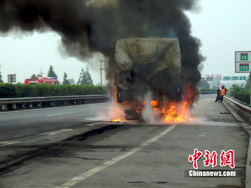 中新網(wǎng)德陽8月9日電 (王超) 9日下午15時50分左右,一輛寧夏牌照的大貨車在行駛至四川成都—綿陽高速德陽黃許鎮(zhèn)路段時,車身突然起火,導(dǎo)致車上裝載的20余噸硝硝酸銨(化肥)猛烈燃燒,濃煙彌漫,隨時都有爆炸危險,高速公路交通一度中斷。經(jīng)過德陽消防官兵緊張?zhí)幹,終將險情排除,此次受阻2個多小時的交通隨后慢慢恢復(fù)。