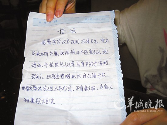過了半個小時之后,施某提出要吃東西!八呀(jīng)三天沒有吃東西,三天來他從沒下過樓,想起來我就心疼。”于是施麗佳下樓買了兩個盒飯帶上去了!霸谶@段時間,我勸他:警察殺你很簡單,為什么不投案自首呢?如果自首他們會保證你的安全,如果你不放心,我們可以和他們簽一份協(xié)議!笔惣严蛴浾叱鍪井敃r協(xié)議的草稿,據(jù)施麗佳稱,協(xié)議的主要內(nèi)容為施某投案自首,警察保證他的安全,并根據(jù)自守的情節(jié)向法院求情。