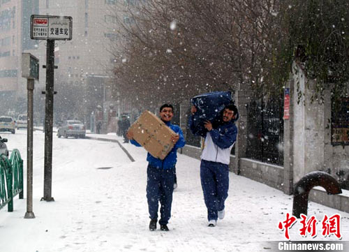 記者在烏魯木齊街頭看到,道路上的行走較往日減少,因?yàn)樘炖渎坊,市民大多都擠上了公交車,還有人焦急地等待出租車。到中午11點(diǎn)時(shí),雪花開始變大,記者到外面拍照采訪,來(lái)回不到二十分鐘的時(shí)間里,記者身上落滿了一層雪花。
