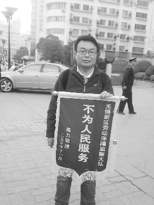 其實我一共做了三面錦旗。最早的一面9月份做的“起訴通用工會法院不受理”,給無錫新區(qū)法院的。“不為人民服務”是給勞動保障監(jiān)察大隊的。第三面還是給法院的,寫的“行政訴訟立案難”,還沒送出去。現(xiàn)在看來第二面最受歡迎。