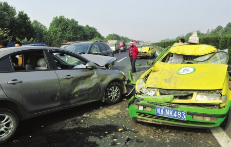 濃霧讓司機(jī)難辨東西,短短數(shù)小時里,該路段7個地點(diǎn)接連發(fā)生52起追尾交通事故。據(jù)交管部門統(tǒng)計(jì),共計(jì)137輛車連環(huán)追尾,并不同程度受損。9人在事故中不同程度受傷。