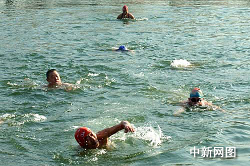 中新網(wǎng)濟(jì)南1月1日電(記者 張榮容 見習(xí)記者 趙金鵬)2009年的第一天,全國第二屆冬泳大賽在山東省城濟(jì)南大明湖景區(qū)內(nèi)舉行。來自北京、天津、山東濟(jì)南、東營、濱州等省市的17支代表隊116名冬泳愛好者相聚濟(jì)南大明湖畔,不畏零下8攝氏度的嚴(yán)寒,以冬泳的方式迎接新一年的開始。