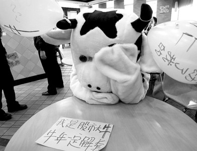 昨天上午10點,徐家匯商圈的人群中突然冒出4名身著卡通服裝的“牛人”,向來往路人送上擁抱和新年祝福。原來,他們是來上海求職的外地大學生,以這種行為藝術(shù)方式為市民送上祝福,同時也鼓勵自己“牛年一定!。聽說他們在征集6000次擁抱或合影,祝福股市沖回6000點,路人方小姐毫不猶豫地拉著男友上前給了一個大大的擁抱!拔覀兊乃椒垮X全套在股市里了,但愿明年迎來牛市。 ”