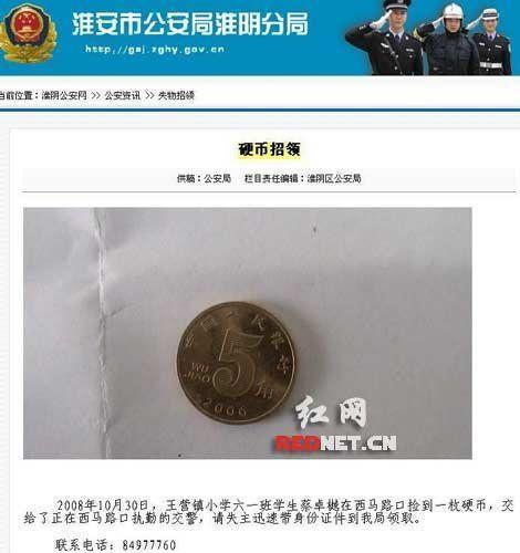 這則5毛錢招領(lǐng)告示系江蘇省淮安市淮陰公安分局所發(fā)。啟示稱,“王營鎮(zhèn)小學(xué)六一班學(xué)生蔡卓樾在西馬路口撿到一枚硬幣,交給了正在西馬路口執(zhí)勤的交警,請(qǐng)失主迅速帶身份證件到我局領(lǐng)取”。啟示上還附有照片,一枚銹跡斑斑的5毛錢硬幣,靜靜躺在照片里。據(jù)悉,這是他們根據(jù)上級(jí)的要求,作為政府信息公開的具體實(shí)施步驟,通過互聯(lián)網(wǎng)發(fā)布失物招領(lǐng)信息。記者搜索到5毛錢硬幣頁面已被刪除。不過,能通過“快照”看到。