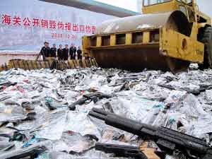 近日,在汕頭海關(guān)舉行的公開(kāi)銷(xiāo)毀走私仿真槍現(xiàn)場(chǎng)會(huì)上,43款共計(jì)42762支仿真槍和配套塑料BB彈9.6噸被壓路機(jī)碾壓銷(xiāo)毀。