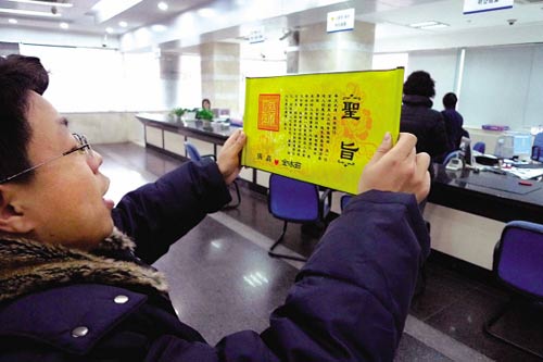 “奉天承運(yùn),皇帝詔曰……張磊要對(duì)她比自己還要好……”昨天上午,在杭州體育場(chǎng)路某銀行,這一電視劇里的場(chǎng)景成了現(xiàn)實(shí):小伙子張磊大約清宮戲看多了,手持“圣旨”,滿腔熱情地宣讀了自己對(duì)女孩小如(化名)的愛(ài)意。