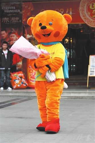 伴著掌聲,一只“小熊”手捧一束粉紅色的玫瑰,從影城內(nèi)走了出來!斑@不就是剛剛在門口發(fā)宣傳單的卡通公仔嗎?”眼尖的旁觀者認(rèn)出它。只見胖乎乎的“小熊”邁著笨拙的步子走到女孩面前獻(xiàn)上玫瑰,隨后取下頭套,和女孩擁抱在了一起。原來,他就是電子屏幕上的男主角。