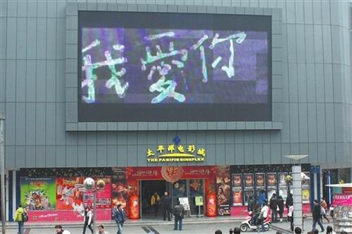 昨日(1月8日)下午3點,人來人往的成都青年路某影院前,一只胖乎乎的“小熊”正在向人群散發(fā)宣傳單。而影院上方的電子屏幕卻突然插播起一條尋人啟事,請現(xiàn)場一位叫“李嬌”的女孩趕緊朝屏幕招招手!斑@是在做什么?”行人紛紛好奇地停下腳步,一名長發(fā)女孩茫然地伸出手揮了揮之后,明星謝娜竟也出現(xiàn)在了屏幕上:“名叫李嬌的女娃娃,你好。你的男朋友讓我告訴你,他很愛你,想一輩子照顧你,永遠(yuǎn)和你在一起!迸⑽孀∽彀停坪醪桓蚁嘈叛矍暗倪@一幕。緊接著,一旁的“小熊”給她獻(xiàn)上了一束玫瑰,突然脫下頭罩,和她擁抱在了一起。原來,這是一場街頭上演的愛情告白。