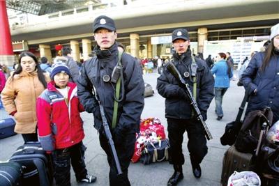 昨天,持槍特警在北京西站巡邏。當(dāng)天,記者從北京鐵路警方獲悉,為確保春運期間旅客的安全,目前,鐵路警方已安排30名特警進駐北京站和西站,負責(zé)在站前廣場24小時持槍巡邏。(本報記者 王儉 王鵬昊 攝影報道)