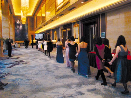 也許佳麗們太緊張了,車到酒店門口時(shí),一大群西裝革履、胸佩飾花的男子迎在門口,嚇得有些人不敢下車。后來才弄清楚,這群人原來是來開婚宴的。隨后,盛裝靚女們被送到一休息室進(jìn)行最后換裝。
