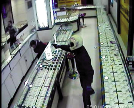 現(xiàn)場(chǎng)錄像顯示,當(dāng)晚7時(shí)20分30秒,一歹徒手持鐵錘,將一柜臺(tái)的玻璃敲碎,將里面的金屬飾品物品放進(jìn)手提包;5秒后,持槍歹徒在一個(gè)角落用槍托狠砸店主何先生頭部;14秒后,珠寶店兩名工作人員趁亂逃離現(xiàn)場(chǎng);29秒后,手捂頭部的何先生欲離開現(xiàn)場(chǎng),被歹徒喝令退回,歹徒上前用手槍再次砸傷何先生頭部,并在店內(nèi)慌亂走動(dòng);51秒后,持鐵錘歹徒先逃離現(xiàn)場(chǎng),持槍歹徒緊跟欲逃離;54秒后,持槍歹徒被民警制服。