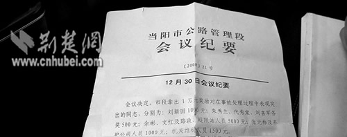 遺體火化當(dāng)日,當(dāng)陽(yáng)市公路段召開(kāi)月度工作會(huì),以紅頭文件印發(fā)的《會(huì)議紀(jì)要》決定:拿出一萬(wàn)元獎(jiǎng)勵(lì)在事故處理過(guò)程中“表現(xiàn)突出”的同志,分別為:劉某1000元;朱某、代某、劉某各500元;余某、文某及路政、超限站人員5000元;張某及養(yǎng)護(hù)公司人員1000元;機(jī)關(guān)維穩(wěn)人員1500元。