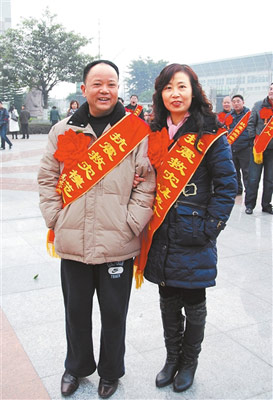在什邡市政府研究室副主任廖曉軍的相機(jī)里,有一張劉慶祿夫妻披著抗震救災(zāi)模范綬帶的照片。廖曉軍說,去年12月30日,市委、市政府召開抗震救災(zāi)表彰大會,辦公室通知劉慶祿參會時,他說自己正在值班,要去幾個受災(zāi)鎮(zhèn)發(fā)放過冬物資,就不參加了。因?yàn)樗鳛槟7秱人代表不能缺席,于是就一再通知他務(wù)必到會。最后,他來不及回家換件衣服,就直接從倉庫趕到大會現(xiàn)場。也在這里,留下了生前最后的影像,也是和妻子的最后合影。