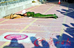 據(jù)現(xiàn)場(chǎng)消防官兵介紹,下陷的大坑有七八米深,因?yàn)槭掳l(fā)地段為填海而成,加上旁邊有施工工地,泥沙流失可能是其下陷原因,擔(dān)心路面出現(xiàn)更大面積下陷,消防救援官兵所開(kāi)來(lái)的專(zhuān)業(yè)吊車(chē)一時(shí)不敢靠近洞口。