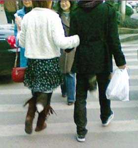 一對年輕的情侶手挽手走在大街上,兩人衣服背后竟各有一條狐貍尾巴。1月19日,有網(wǎng)友在網(wǎng)上發(fā)帖稱,自己在楊家坪直港大道遇到了身著“狐尾裝”的一對男女,并附有手機拍攝的照片。該帖發(fā)出后,引來網(wǎng)友熱議,許多80后的網(wǎng)友直呼“妖孽”,并大嘆跟不上這種怪異潮流。