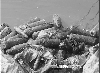 昨日上午,在廣州白云區(qū)石井河涌邊,打撈垃圾的環(huán)衛(wèi)工人在泥堆中發(fā)現(xiàn)許多炮彈(見上圖,市民提供)。目前,警方已將附近封鎖,等待退潮后打撈處理。