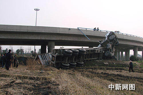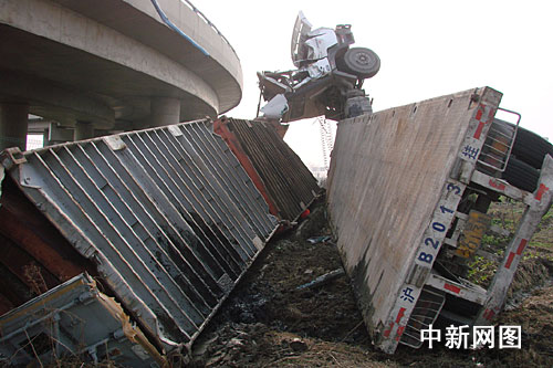 中新網(wǎng)湖州1月23日電(記者袁爽 通訊員汪焱)近日,一輛重型集裝箱半掛車在途經(jīng)申蘇浙皖高速公路皖向織里下主線匝道處時(shí),不僅超速行駛,更是嚴(yán)重超載超限,結(jié)果該車在高速路上玩起了“變形金剛”,釀成慘劇。據(jù)了解,出事車輛碰撞右側(cè)護(hù)欄后翻下落差7米的橋梁。記者俯瞰現(xiàn)場,該車就像是美國大片《變形金剛》里躺下的擎天柱,所幸車上人員受傷較輕,無生命危險(xiǎn)。